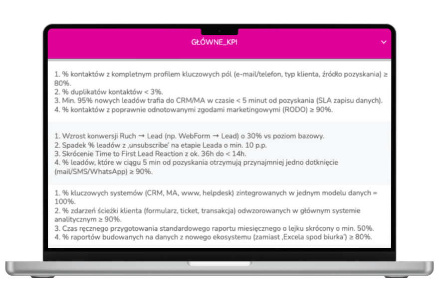 Cele biznesowe, etapy wdrożenia, mierniki sukcesu, procesy, zadania, systemy, zespół. Nic Ci nie umknie, nie przeoczysz żadnego elementu - zaplanujesz każdy etap, rozpiszesz składowe każdego procesu, właściwie przydzielisz zadania.