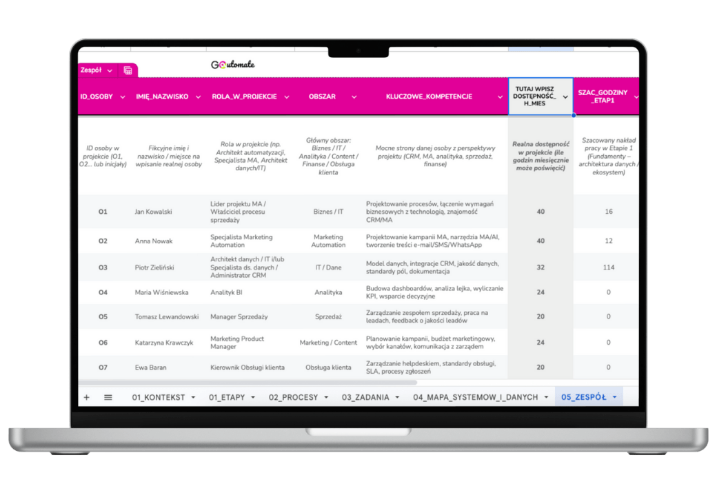 Nie musisz zastanawiać się ile czasu powinna zająć realizacja danego zadania. Przy każdym znajdziesz nasze sugestie co do ilości godzin. Proponowane godziny łatwo podmienisz, a wbudowane formuły automatycznie skorygują wartości czasowe w pozostałych arkuszach.